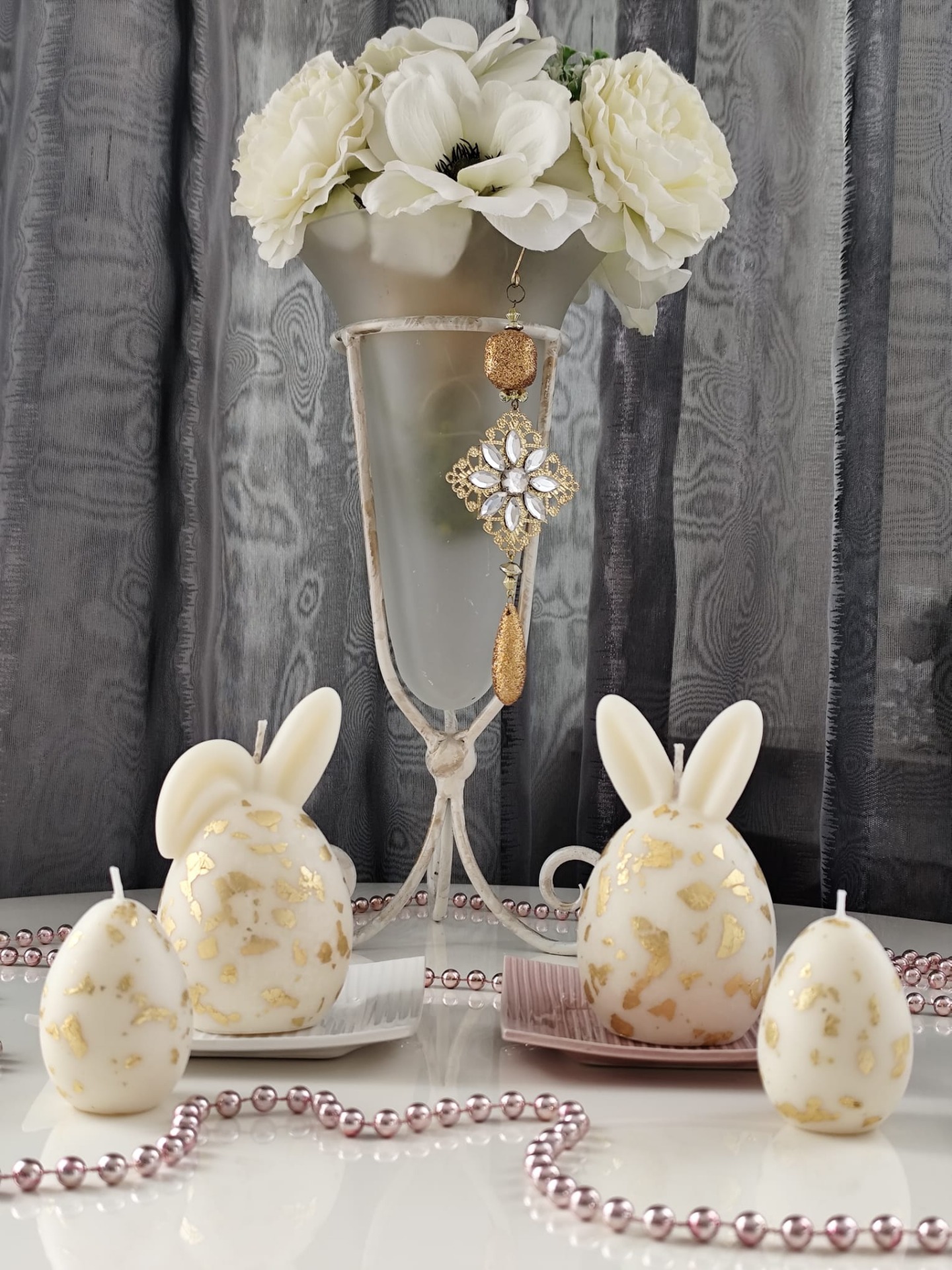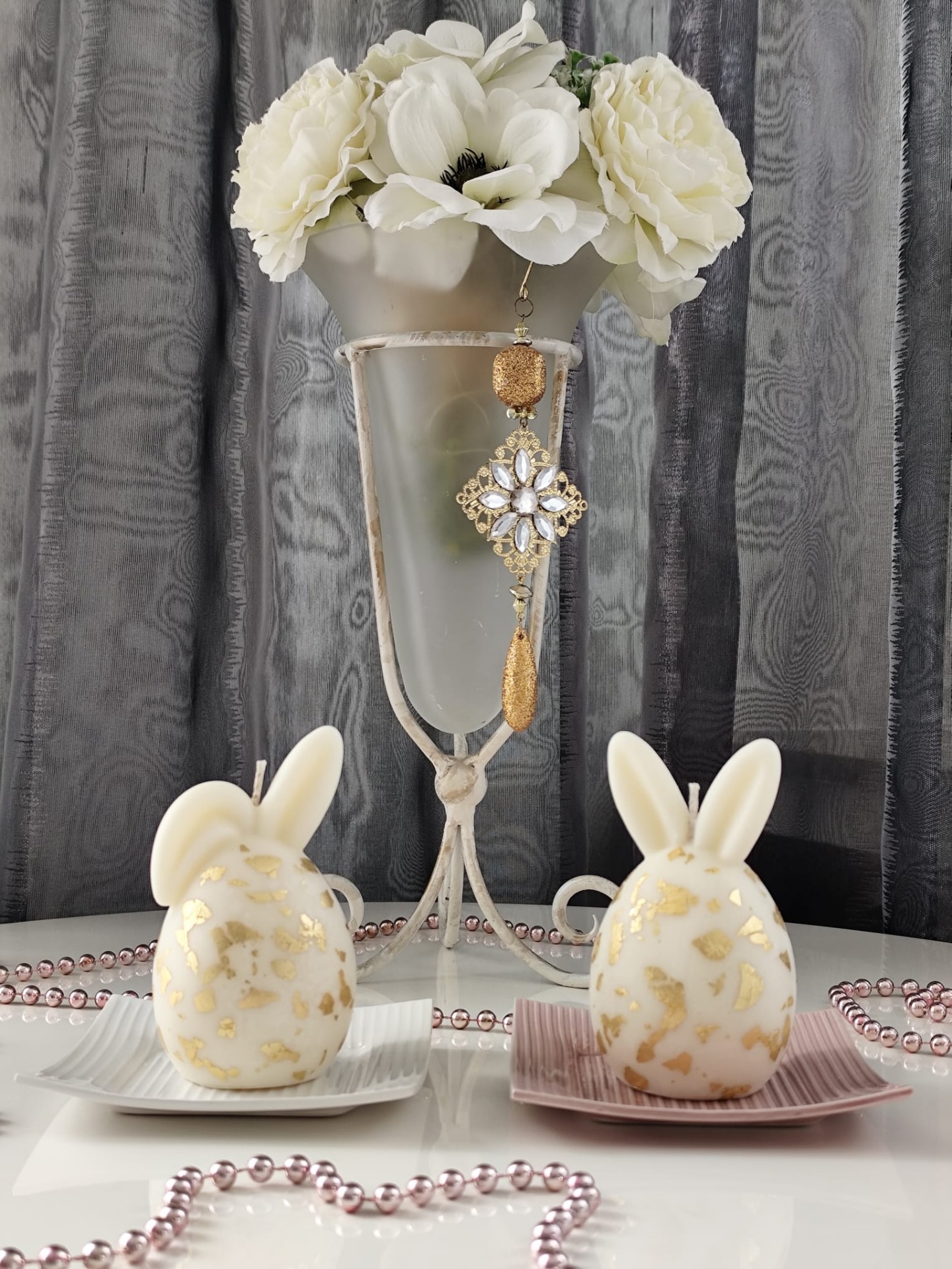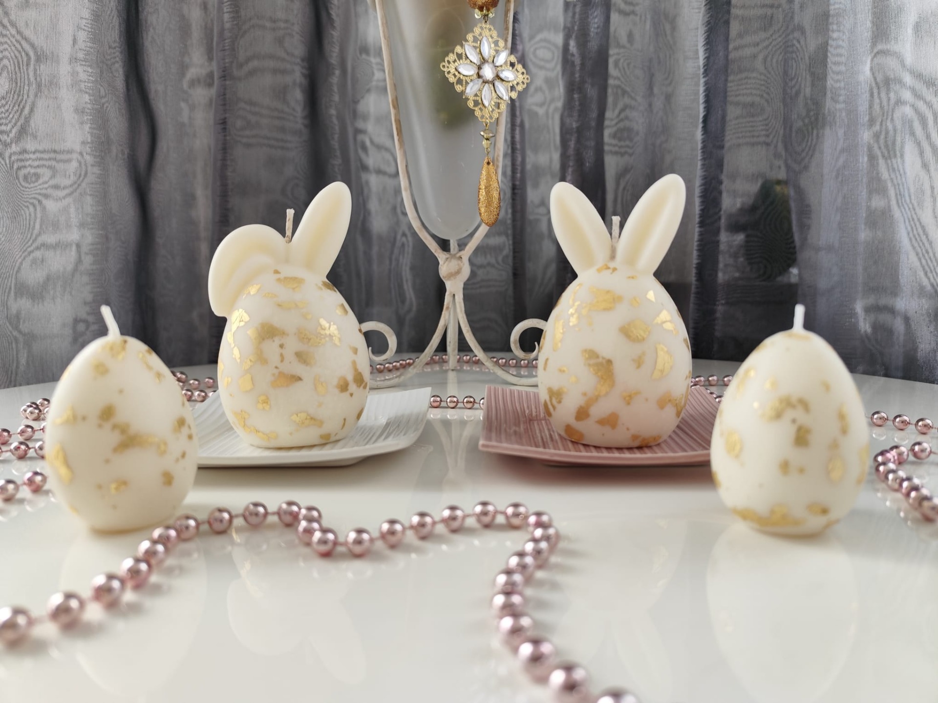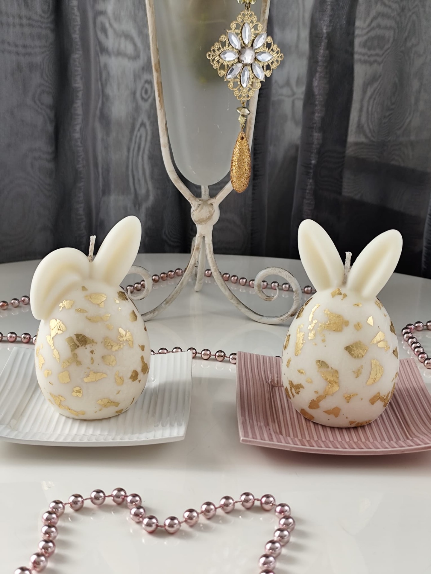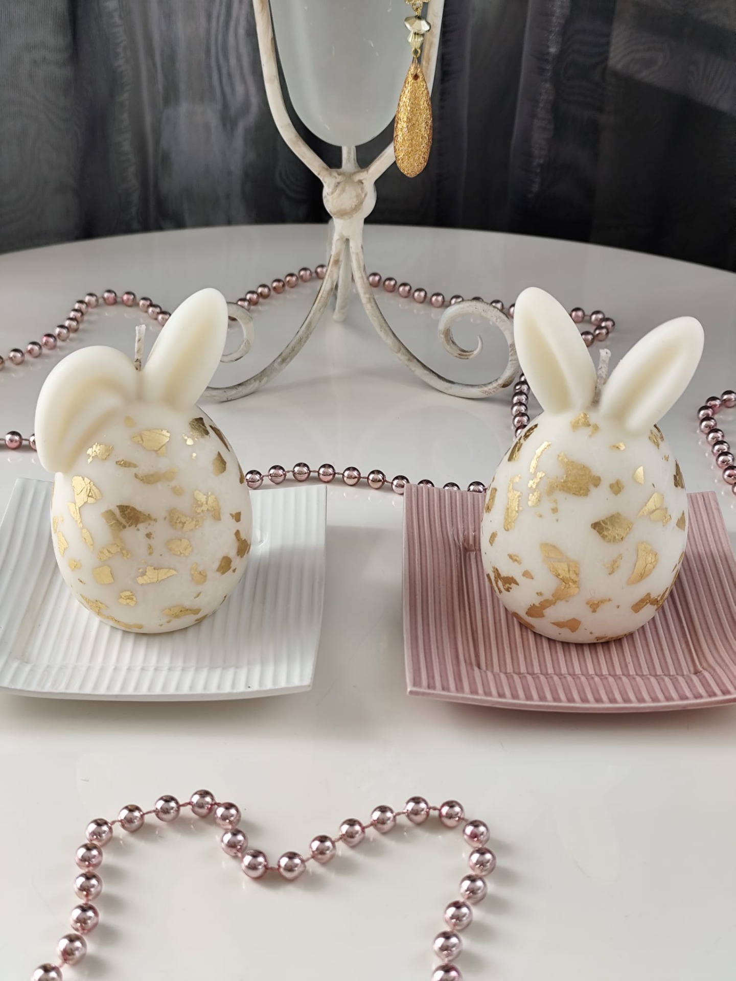 Luxusní svíčky ve tvaru velikonočních vajíček s oušky. Elegantní dekorace, která vynikne na svátečním stole, komodě i jako součást jarní výzdoby. Sada obsahuje 2 kusy svíček. Bez podstavce.