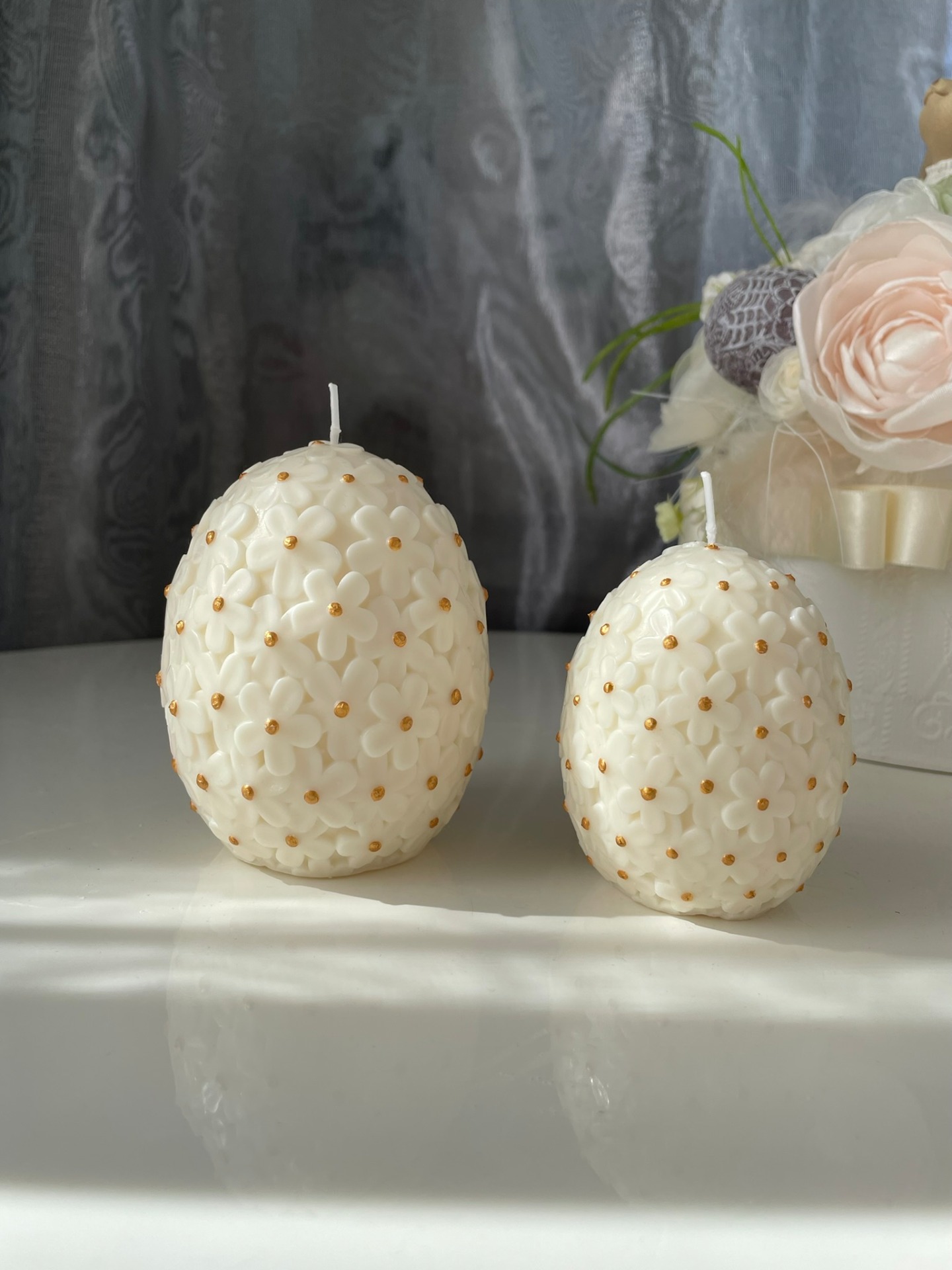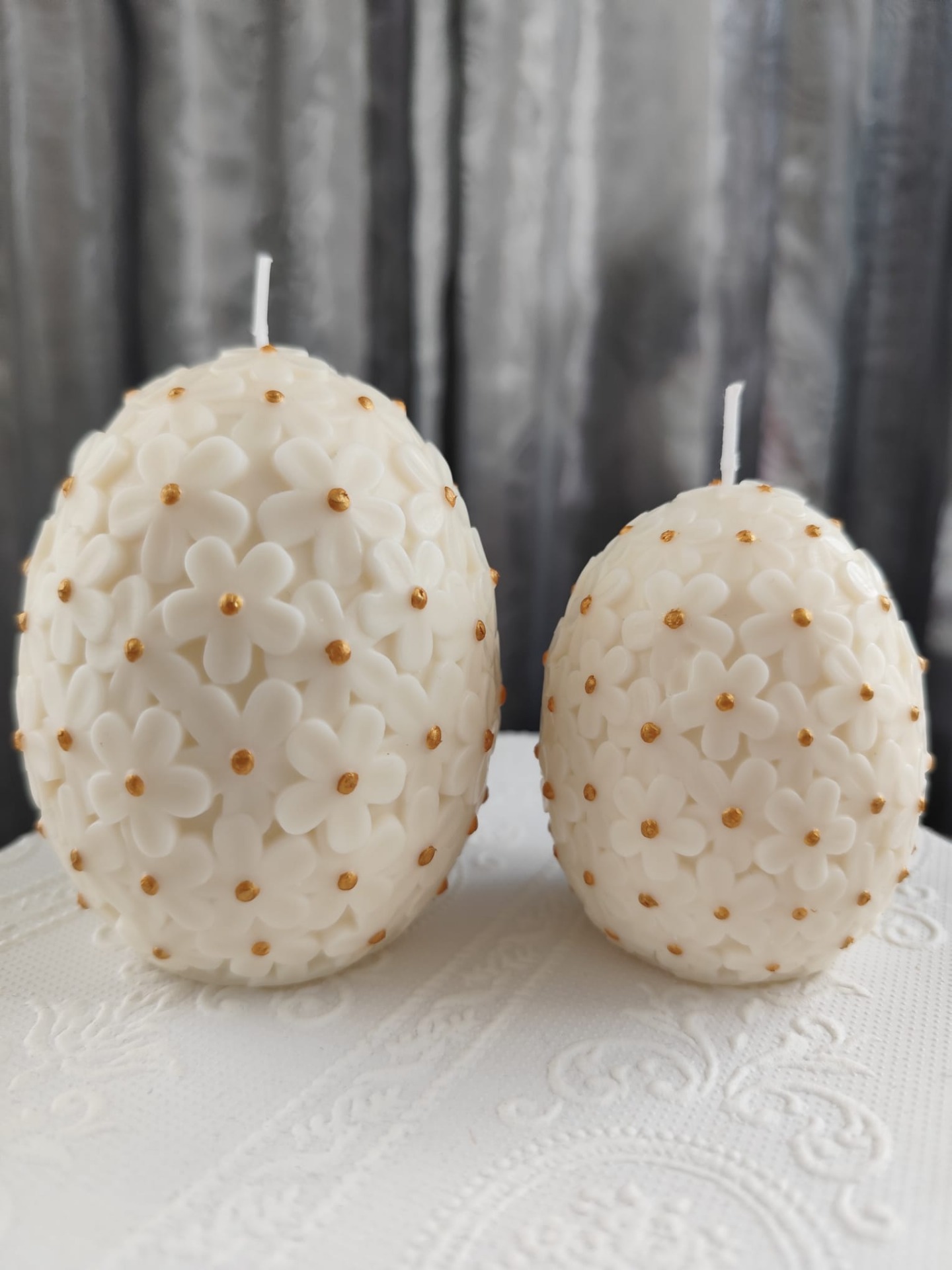 Luxusní svíčky ve tvaru velikonočních vajíček ve dvou velikostech zdobených květinami a zlatou barvou.