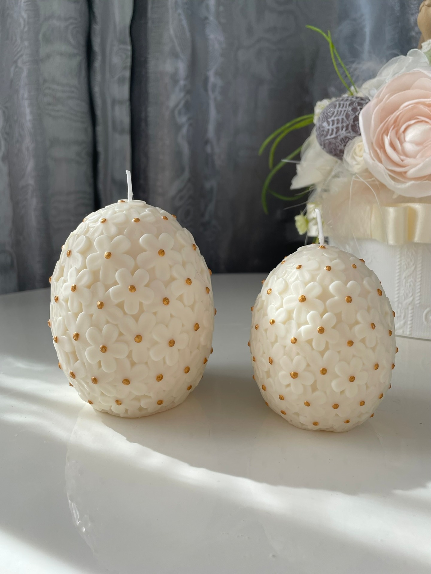 Luxusní svíčky ve tvaru velikonočních vajíček ve dvou velikostech zdobených květinami a zlatou barvou.