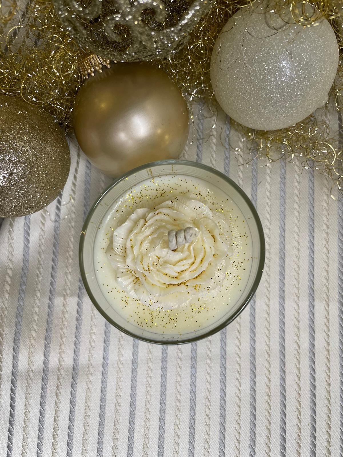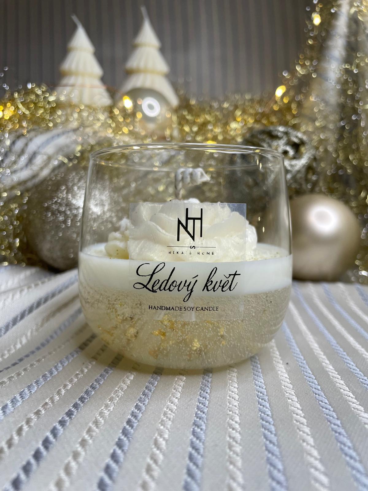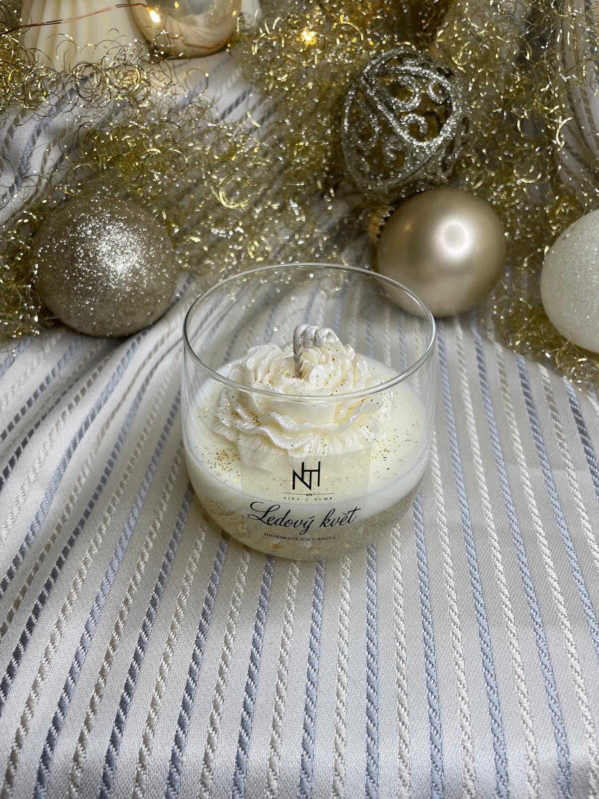 Luxusní svíčka ve tvaru vánoční pivoňky ve skle.
